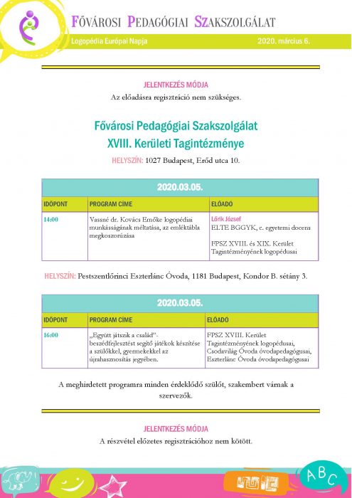 „Mi a szösz, Szösz néne?” (Varró Dániel)-új utak a logopédiában címmel logopédiai konferenciát tervezünk október 13.-ára.A program a 6-7. oldalon olvasható:https://www.oktatas.hu/pub_bin/dload/kozoktatas/pok/Budapest/opn_2020/OPN_programfuzet_.pdf?fbclid=IwAR1AZ1MDIg0sTuZeWeKl-kpZsr7E2cX_6szDcwnxxCkZRWQ3TeVlQKlZsLURegisztráció:https://www.oktatas.hu/konfreg/!KonfReg/index.php/konfreg/index/regisztacio_opn_bp_pok?fbclid=IwAR2drHYeJfnBGTT5S5xEtdVQQWBLo1BbBUB7ngpRez_jGyqo_UQYVDuWqvAAki nem tudna regisztrálni, annak üzenem, hogy már dolgozunk a bővítésen!